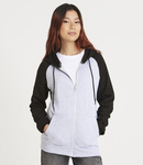 Charcoal 52% ringspun cotton/48% polyester. Soft cotton faced fabric. Brushed back fleece. Raglan sleeves. Contrast double fabric hood with flat lace drawcord. Full length contrast plastic YKK zip. Contrast sleeves. Front pouch pockets. Ribbed cuffs and hem. Twin needle stitching. Tear out label.