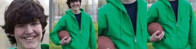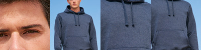 79% cotton/20% polyester/1% viscose. Cotton faced fabric. Brushed back fleece. Drop shoulder style. Lined hood with self colour drawcord. Taped neck. Locker patch. 2x2 ribbed cuffs and hem. Front pouch pocket. Unbranded size label at neckline.