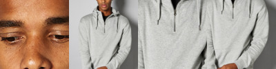 80% cotton/20% polyester. Soft cotton faced fabric. Three yarn low shrinkage fleece. Brushed back fleece. Drop shoulder style. Zip neck with self colour plastic zip pull. Taped neck. Ribbed cuffs and hem.