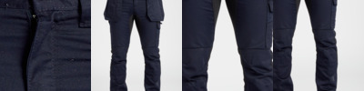 65% recycled polyester/35% cotton kingsmill fabric. UPF rating 40+. Part elasticated waistband with belt loops. Zip fly with button over. Two side pockets. Holster pockets. Two rear patch pockets. Media pocket. Left leg cargo pocket. Right leg hammer loop and ruler pocket. Stretch panelling in key movement areas. Top loading knee pad pockets. Knee pads available PW102.