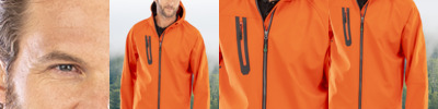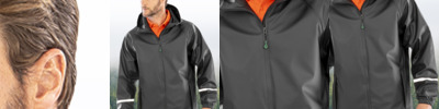 Three layer bonded soft shell. Recycled polyester outer layer. Waterproof 8000mm, breathable 1000g and windproof TPU membrane. Recycled knitted polyester inner layer. Contrast lining (orange/navy only). Integral hood. Full length zip with chin guard and inner zip guard. Hanging loop. Right chest pocket. Two front zip pockets. Elasticated cuffs with thumbholes. Longer back panel. Access for decoration.