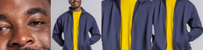 55% polyester/45% cotton. Brushed back fleece. Drop shoulder style. Full length YKK zip. Two front YKK zip pockets. Side seams. Ribbed cuffs and hem. Twin needle stitching.