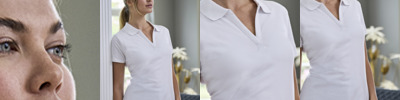 95% organic ringspun combed cotton/5% elastane. Mini piqué. Double pre-shrunk. Enzyme washed. Silicone treatment. Tailored fit. Flat knit collar with elastane. Herringbone taped neck. Open V placket. Twin needle cuffs and hem.