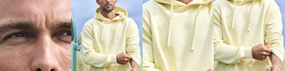 100% organic ringspun cotton. Doubled dyed. Enzyme wash. Silicone treatment. Brushed back fleece. Drop shoulder style. Loose fit. Two panel layer hood. Half moon back yoke. Front pouch pocket. Ribbed cuffs and hem with elastane. Tag free.