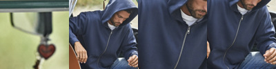 70% organic ringspun cotton/30% recycled polyester. Doubled dyed. Silicone treatment. Brushed back fleece. Drop shoulder style. Relaxed fit. Two panel layer hood. Half moon back yoke. Full length SBS zip. Two front pockets. Ribbed cuffs and hem with elastane. Tag free.