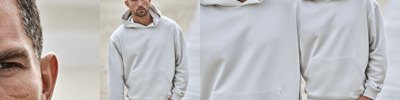 70% organic ringspun cotton/30% recycled polyester. Doubled dyed. Silicone treatment. Brushed back fleece. Drop shoulder style. Relaxed fit. Two panel layer hood with self colour drawcord. Half moon. Front pouch pocket. Ribbed cuffs and hem with elastane. Tag free. 60°C wash.